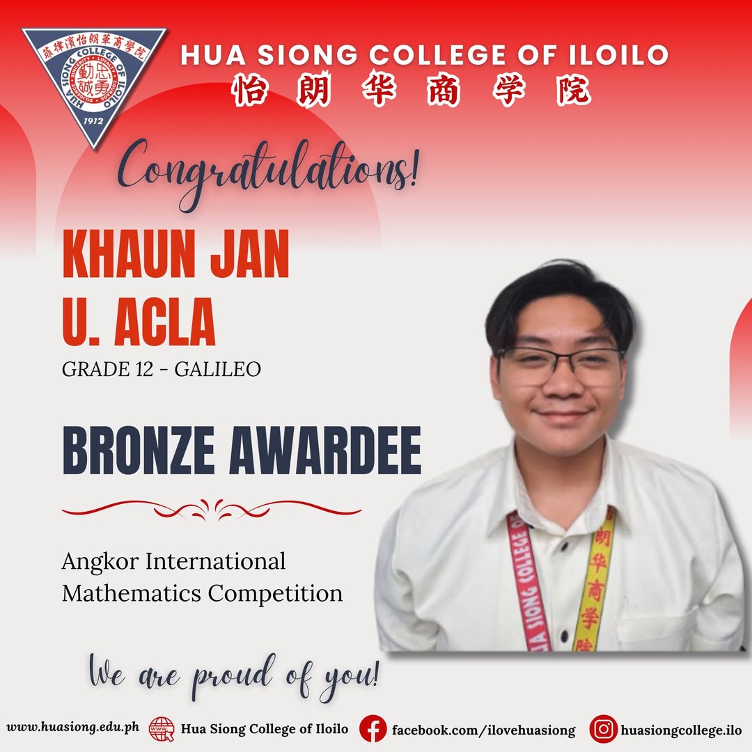 Congratulations, Khaun Jan U. Acla of Grade 12 Galileo, for winning the Bronze Medal in the Angkor International Mathematics Competition!
