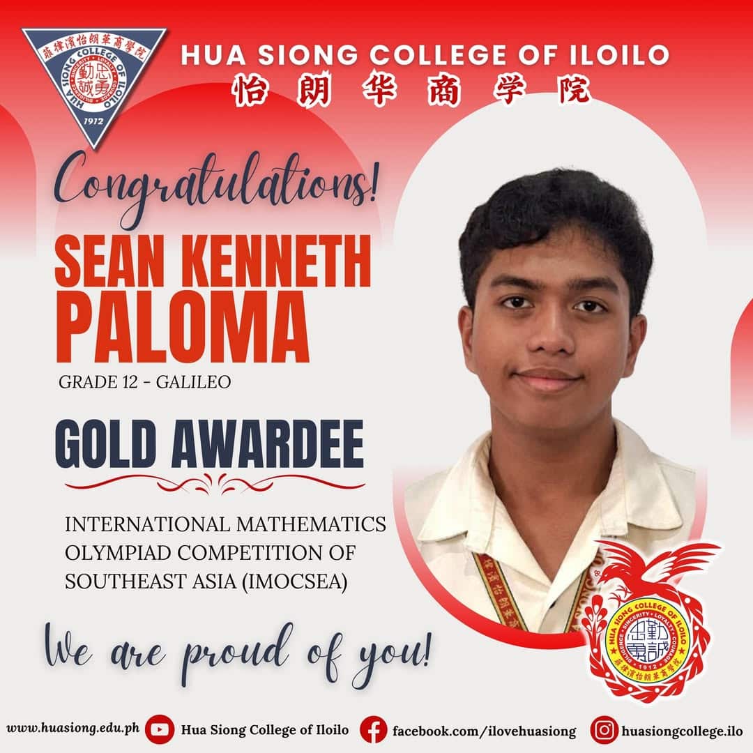 Sean Kenneth D. Paloma of Grade 12, Galileo, has brought pride and honor to Hua Siong College of Iloilo by winning the Gold Medal in the International Mathematics Olympiad Competition of Southeast Asia (IMOCSEA)! 🏅✨