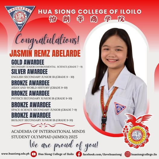 Jasmin garnered multiple distinctions at the Academia of International Minds Student Olympiad (AIMSO) 2025: Gold Awardee โ Secondary Junior Environmental Science (Grade 7โ9) Silver Awardee โ English Secondary Junior 1B (Grade 9โ10) Bronze Awardee โ Asian and World...